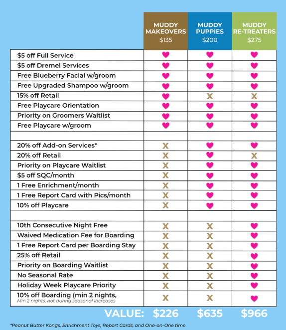 A local Austin boarding facility that recently launched memberships, just has this chart on their memberships page.