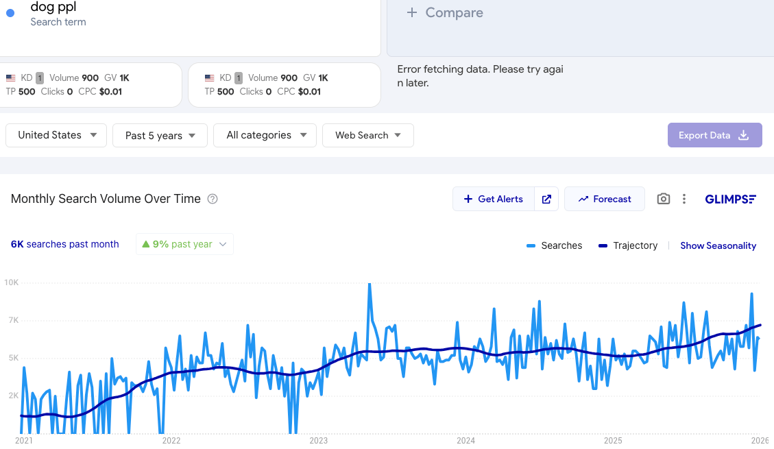 The rising baseline suggests more people now know what Dog PPL is and are searching it directly.
